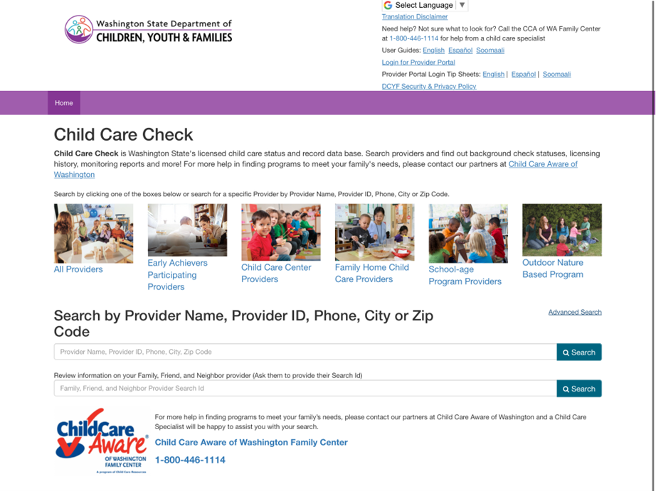 I landed on the state website for the Department of Children, Youth, and Families (DCYF). Among other things, the site serves as a tool for families to find childcare options. It lists every provider in the state, with information on the owner, address, capacity, inspection history, and language.